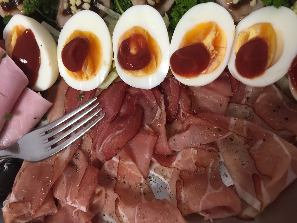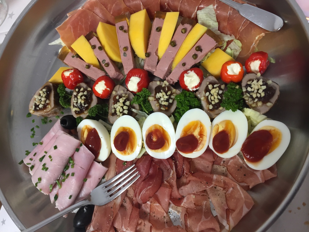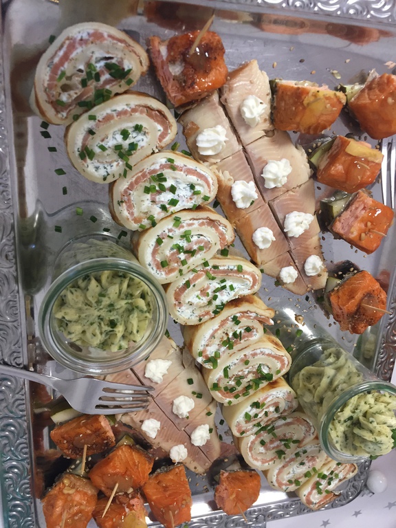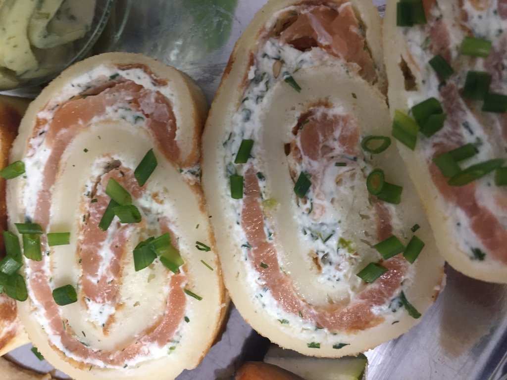 Rauch-Lachs mit Kräutern und Créme Fraîche im Pfannkuchenteig gerollt.